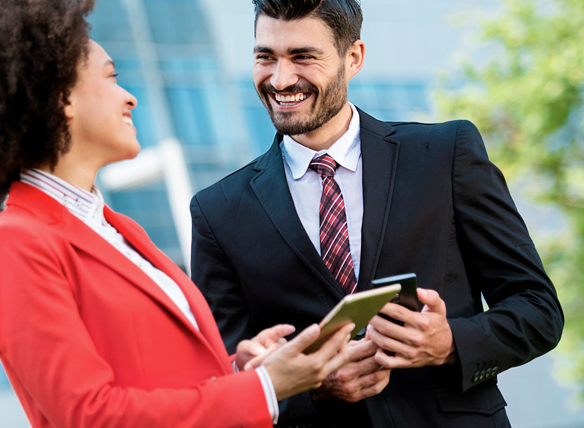 Dry cleaner happy business man and woman in dry cleaned clothes